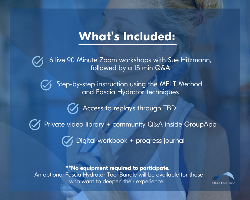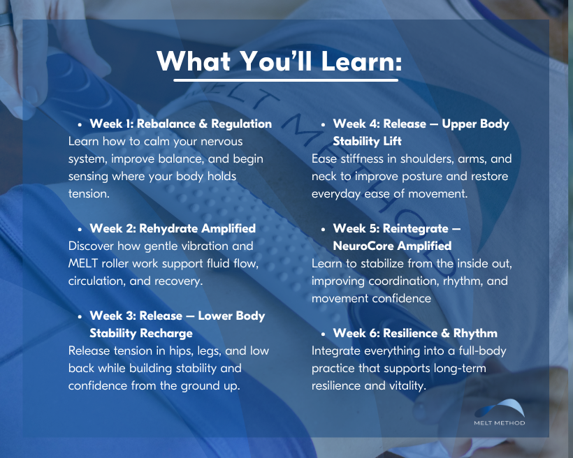 Designed for all experience levels, each tool works together to help you reconnect, rebalance, and rehydrate your body through simple, effective techniques used in MELT workshops and series.