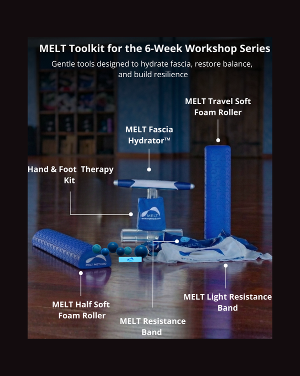 The MELT Fascia Series Workshop Pack includes everything you need to support daily self-care, restore hydration to fascia, and build whole-body resilience. This curated bundle combines MELT’s signature soft tools with gentle resistance and vibration to help reduce tension, improve mobility, and support lymphatic flow—at home, on the mat, or on the go.